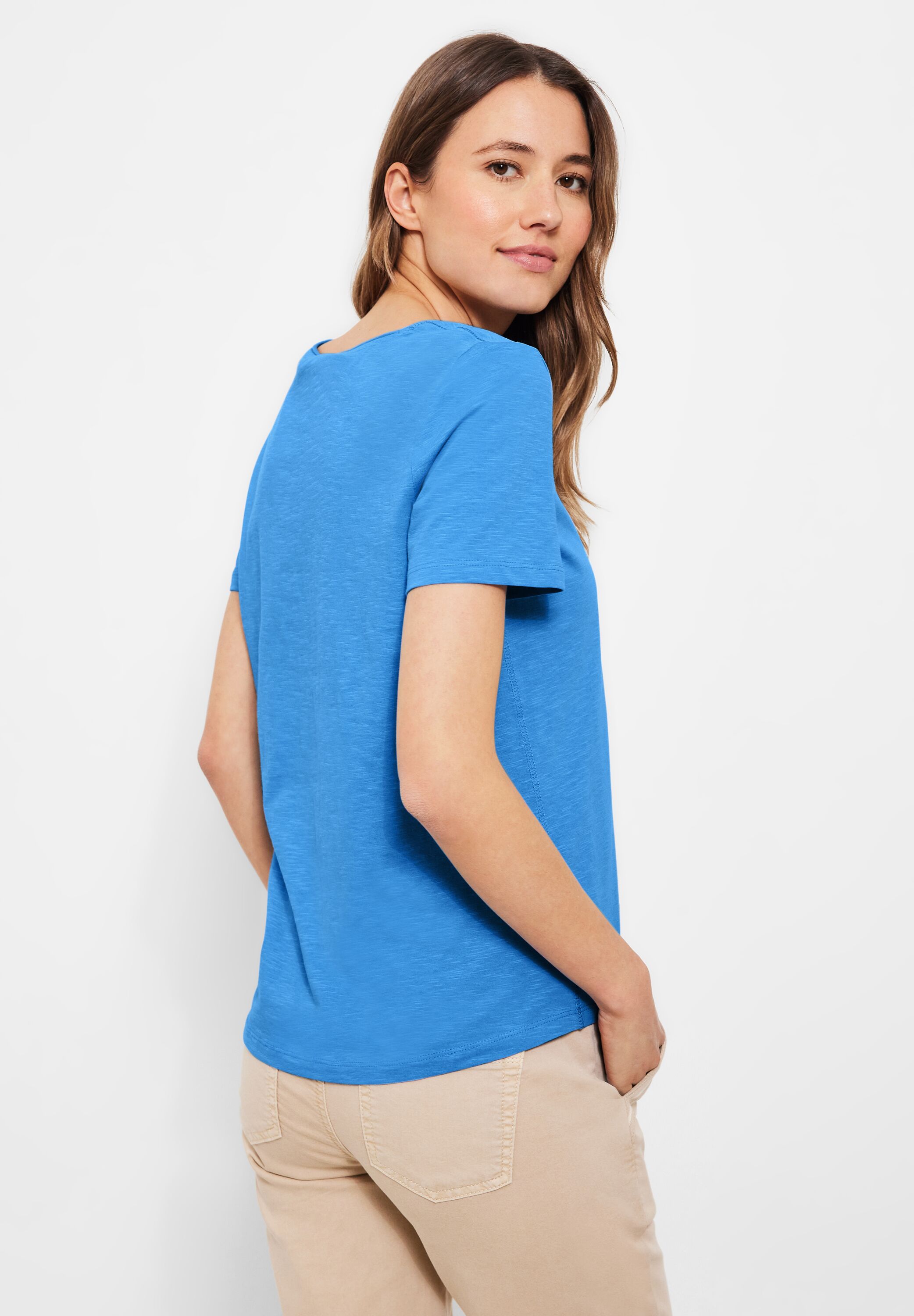 Feel good! So ein Damen T-Shirt von CECIL eignet sich für jede Gelegenheit. Basic Style und Unifarbe in Flammgarn machen es zum Kombi-Liebling. Der abgerundete V-Ausschnitt trägt sich lässig-leger.