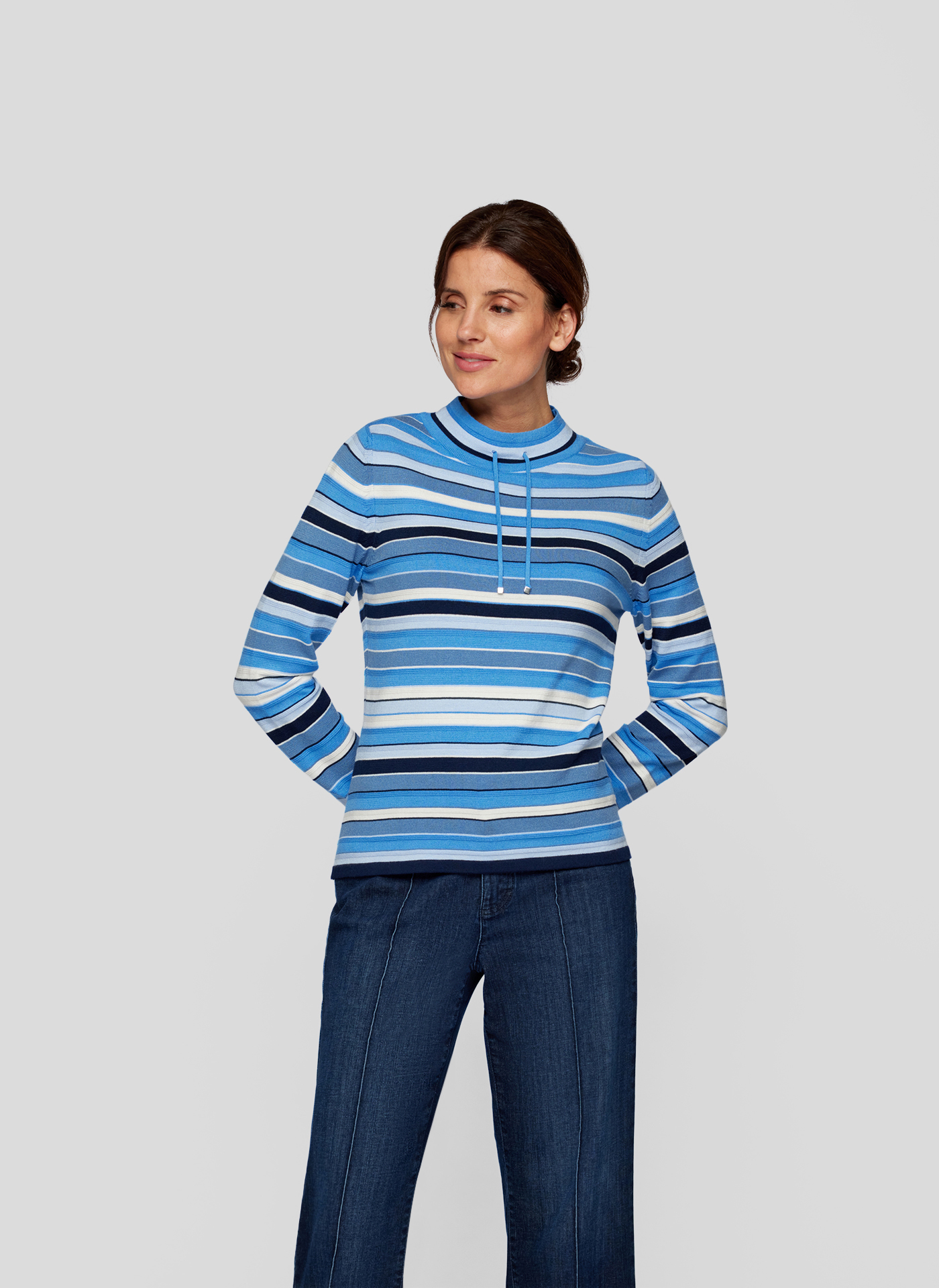 Der lockere Stehkragen mit Kordelzug verleiht dem Pullover eine sportliche Note. Die klassischen Ringel in verschiedenen Blautönen sorgen für einen zeitlosen, maritimen Look. Der weiche Strickstoff bietet ein angenehmes Tragegefühl und hält an kühleren Tagen wohlig warm. Ein vielseitiger Begleiter für entspannte Freizeitlooks _ stylisch und gemütlich zugleich!