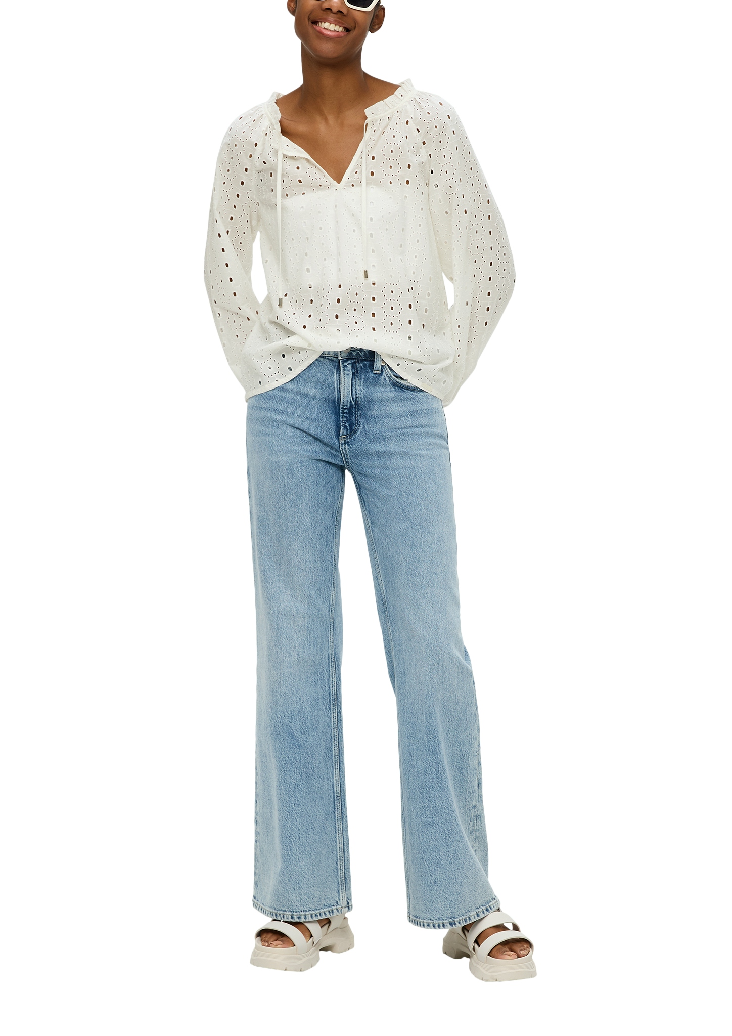 Diese vielseitige Bluse aus leichter Baumwolle ist der perfekte Begleiter für warme Sommertage. Das lockere Oversized-Modell mit lässigen langen Ärmeln und V-Ausschnitt überzeugt mit seinem femininen Rüschenkragen und der dekorativen Lochstickerei. Das angesagte Bindeband am Ausschnitt verleiht einen charmanten Finish-Touch. Ob zu lässiger Shorts oder zur Lieblingsjeans - diese luftige Bluse ist ein wahrer Kombinationsprofi. Style sie ganz nach Lust und Laune für einen entspannten Everyday-Look oder einen gemütlichen Ausflug in der Natur. Entdecke jetzt dieses vielseitige Must-have für die Sommersaison!