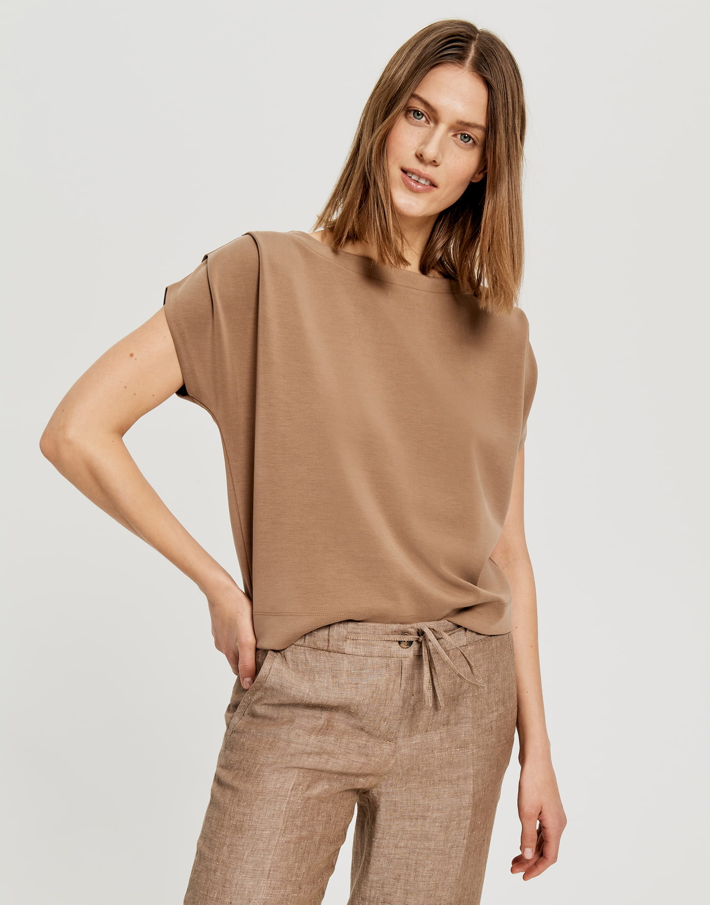 Modal-Mix, Samtige Oberfläche, Weiter Body, softer Griff, Fältelung an der Schulter / Schulterdetail, das Model ist 176 cm groß und trägt Größe 36