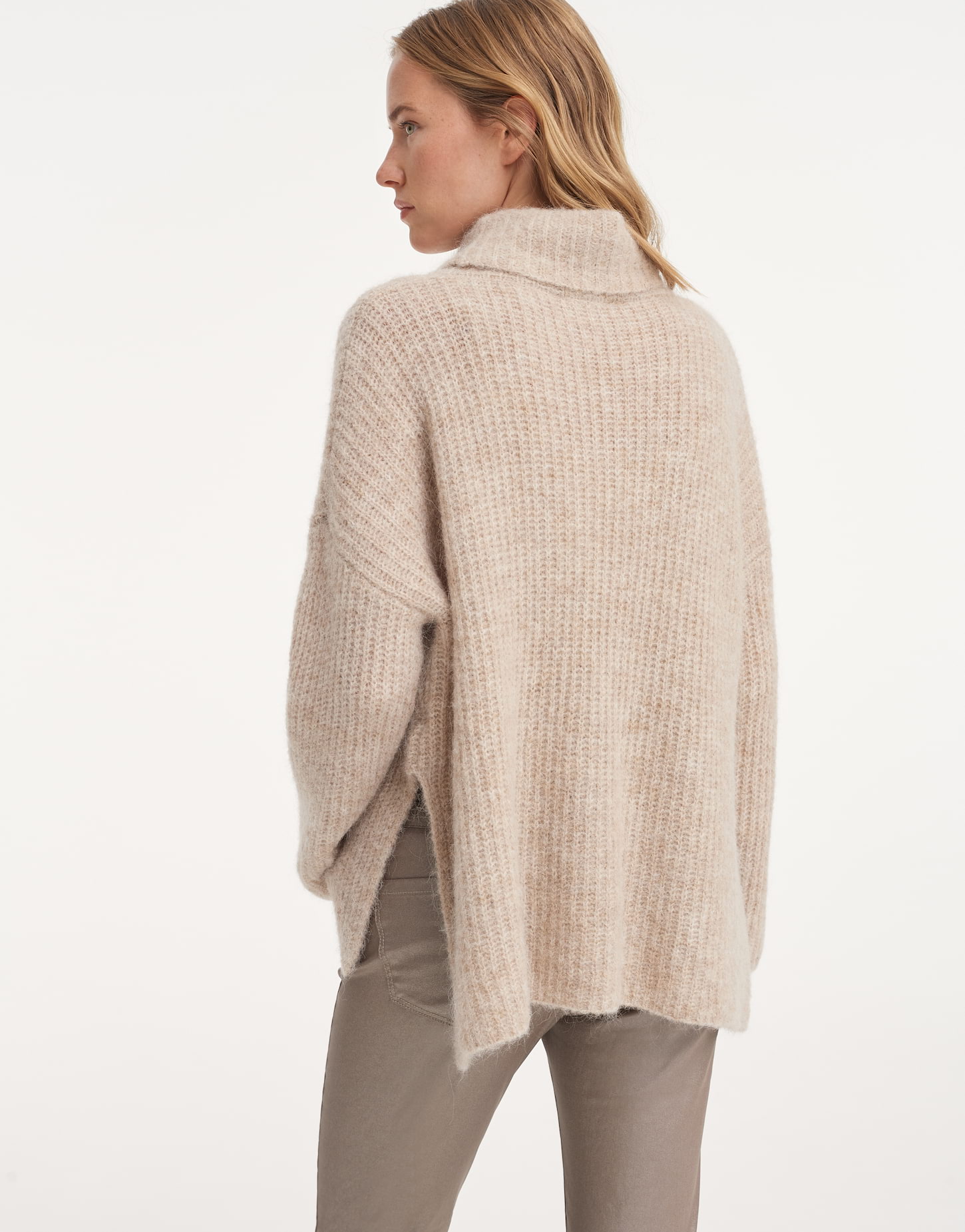 Wollmix mit Alpaka, oversize Shape, überschnittene Schulter, halsferner Rollkragen, weicher Griff, lange Seitenschlitze, das Model ist 176 cm groß und trägt Größe S