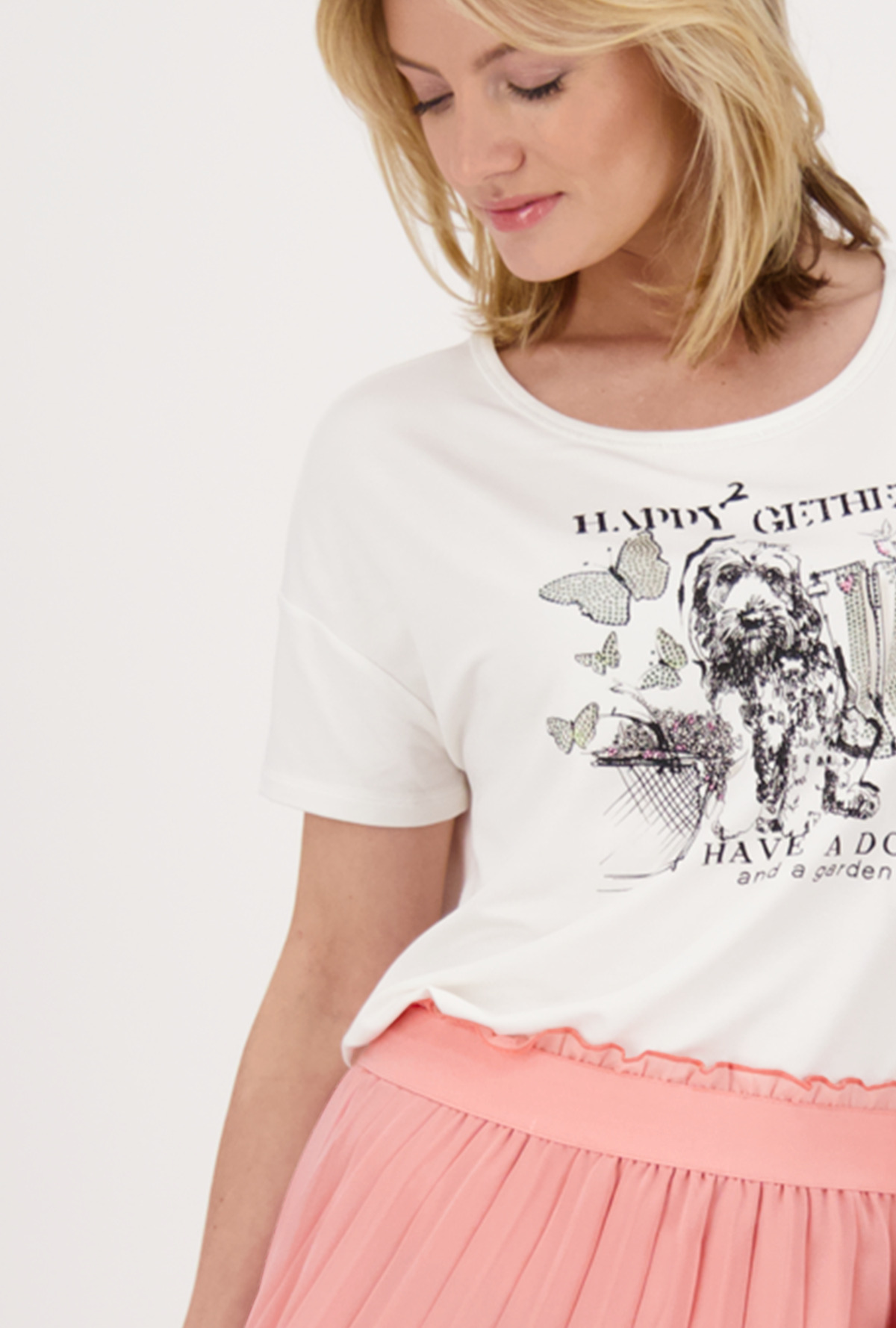 Dieses Rundhals Modell von monari bietet Ihnen einen atmungsaktiven, hautfreundlichen und sanften Tragekomfort dank der Verarbeitung aus einem fließenden Viskose-Mix mit hohem Stretchanteil. Gerade geschnittene Form mit Halbarm und überschnittenen Schultern. Die Vorderseite zeigt sich mit einem gartenähnlichen Druck mit Hund, Schmetterlingen, Stiefel und Eimer mit Blumen und einem zusätzlichen Schriftdruck. Styling-Tipp: tragen Sie dieses coole Shirt in Off-White zu einem zart fließenden Plisse-Rock und einer Jeansjacke. Mit dem Kauf dieses Artikels unterstützen Sie die Bernhard-Bosch-Stiftung.